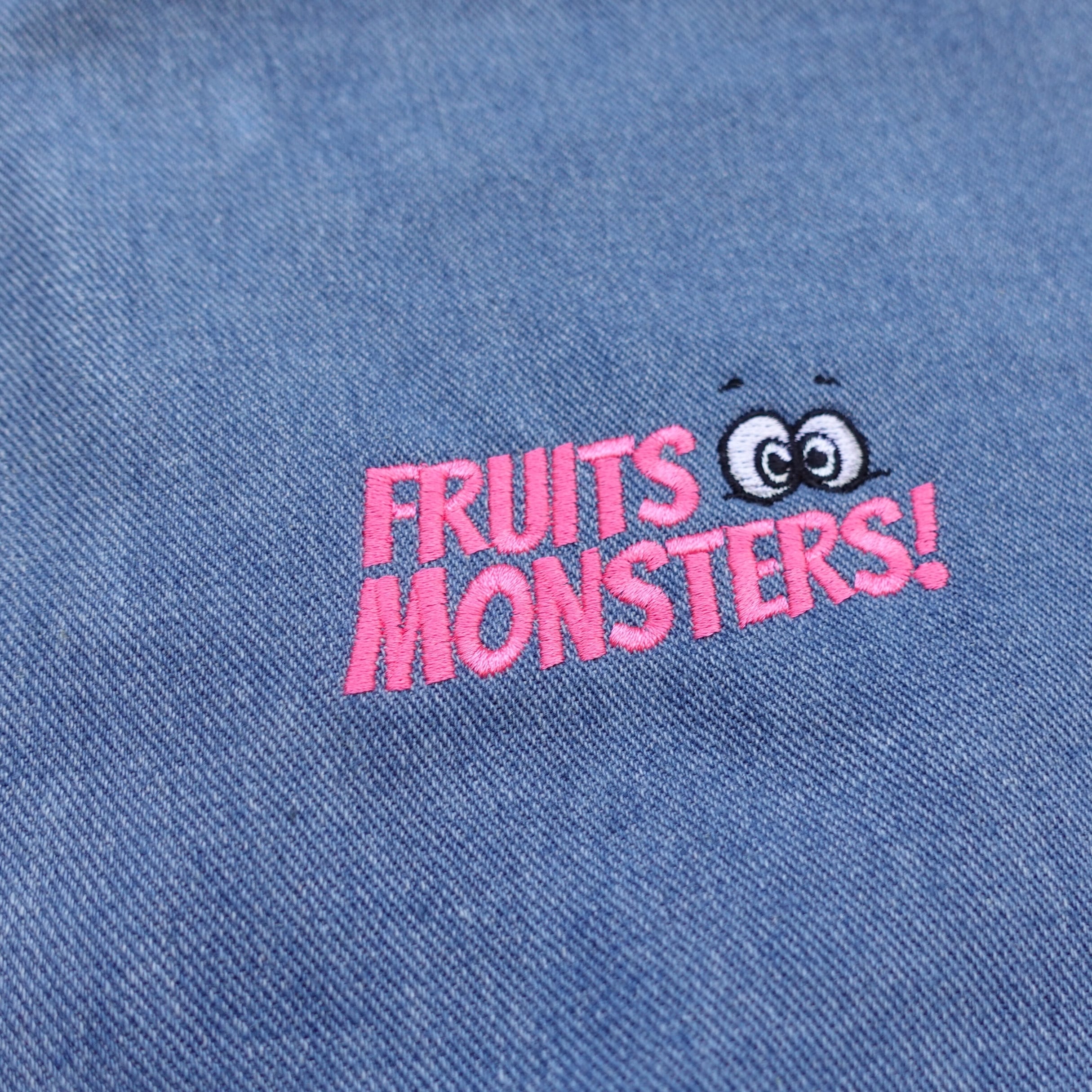 サマーブルーのデニム生地にフルーツのモンスターズのロゴが刺繍されたトートバックです。 ピーターの目が覗いているのがポイント。 トレンド感のあるカラーリングでコーディネートにも合わせやすく、様々なシーンで大活躍。 大きめで丈夫なので色々と入ります。荷物が多い日も安心のビービーハーバリウムーとバックです。 サイズ:縦36cm 横37cm マチ:15cm